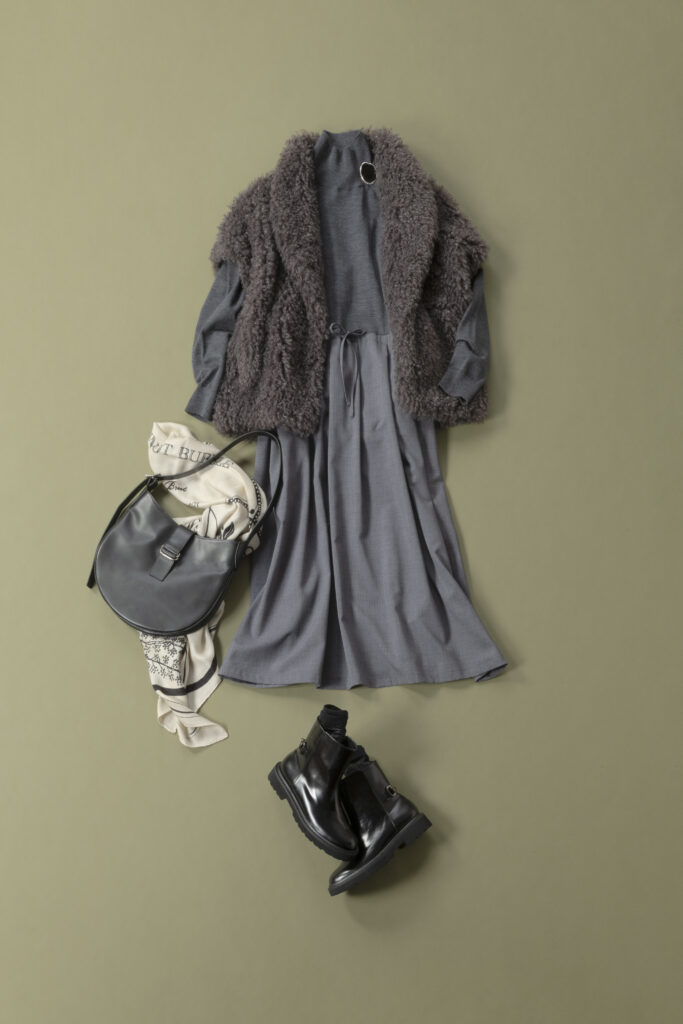 ニードルファーのジレはシンプルなコーディネートを華やかに彩る冬のマストアイテム。