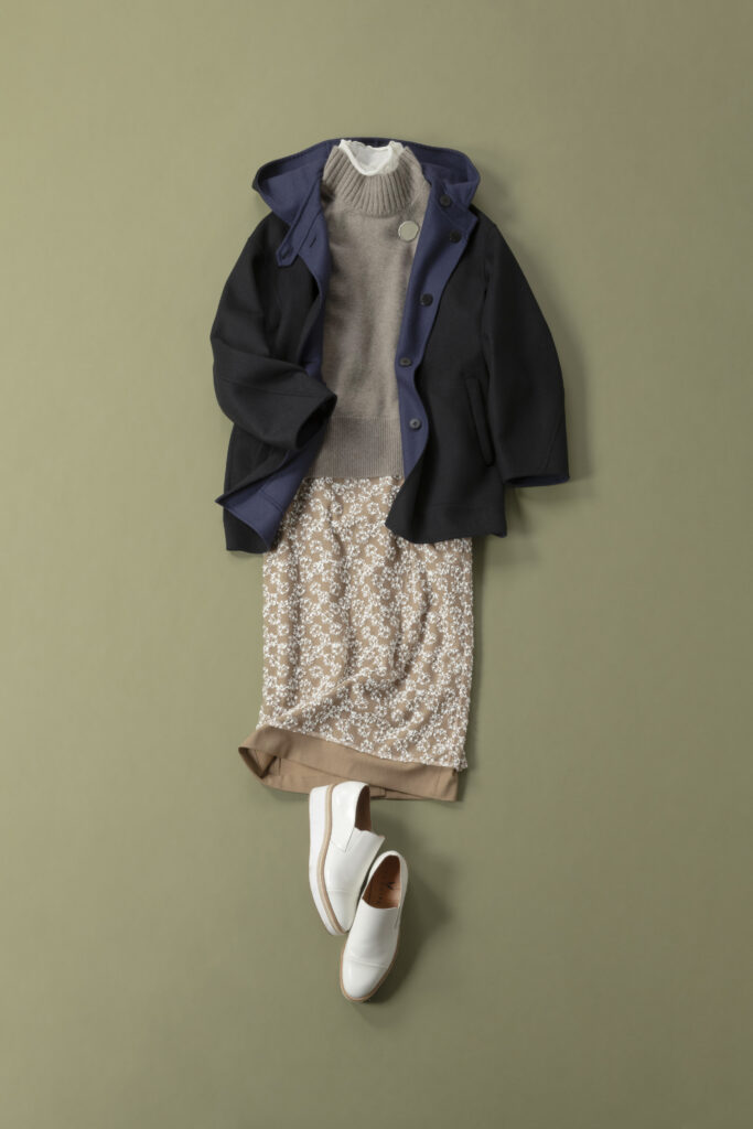 フーデットコートを合わせたカジュアルスタイルも上品な佇まいに。
