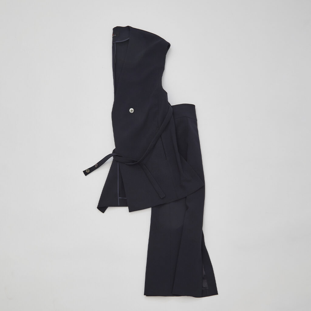 セットアップは、スリムシルエットが特徴的。ノーカラーのジレは、